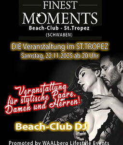 Finest Moments – Club Night Wir freuen uns auf einen super ausgelassenen Abend, zusammen mit ... 22 Nov. 20:00 Uhr - 04:00 Uhr Club St.TropezLinker Kreuthweg 11, 86444 Mühlhausen