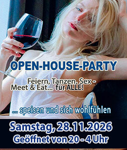 Open House-Party für ALLE Die OPEN HOUSE Swingerparty mit Programm! Vor Silvester nochmal Feiern, ... 28 Nov. 20:00 Uhr - 03:00 Uhr Club St.TropezLinker Kreuthweg 11, 86444 Mühlhausen