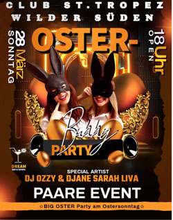 Das ultimative Oster Swingerclub Special im Premium 5 Sterne Club St.Tropez Augsburg-Mühlhausen mit Ozzy und dem Wilden Süden!!! OSTER SWINGER SPECIAL UND PARTY – Alle sind willkommen – Sexy & Frivoler Dresscode. Geniessen und erleben! Special Oster Programm 2 leckere Cocktails von Chris dem Barkeeper – Massagen von Bini – Indoor Beach Spielwiesen für Paare und kostenloses, Heute mit Ostereiersuchen und Verlosung von Eintrittsgutscheinen im Wert von 500 Euro! Partysound von dem Wilder Süden Dreamteam Kathi Kess und DJ Ozzy– St.Tropez Köstlichkeiten ALL INKLUSIVE! Feinstes Essen, wie ihr es von uns gewohnt seid. Heute ein vielseitiges Antipasti-Buffet. Coole Drinks inklusive!!! 1 Preis – Alles drin. Bei schönem Wetter auch mit Sonnenterasse und Beach Area!!! Dresscode: Sexy, Stylisch. Geöffnet von 18 – 3 Uhr.