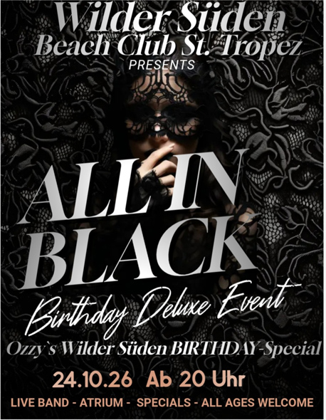 Ozzy und der Wilde Süden feiern Gebrustatg! ALL IN BLACK!!!! Viele WILDER SÜDEN Geburtstags-Specials! Mit der geilen Live Band CROSSFIRE, wird die Luft bei den besten Hits der 70er, 80er und All Time Classics zum Geburtstag brennen! Die heisseste Mottoparty GANZ IN SCHWARZ in Süddeutschland – Laser & Nebelshow und guter Stimmung mit Djane Sarah Liva! Willkommen zur heißesten ALL IN BLACK Motto-Erotikparty in der Erotik Disco A1 Atrium und dem Beach-Club St.Tropez. Der heißeste Mix aus Feiern, Swingen, Genießen………. „Willkommen sind alle, die gerne Sex & Party verbinden, Paare, Ladies und Selektierte Single Herren mit Voranmeldung per Joyclub! DRESSCODE SCHWARZ!!!!! Taucht ein in eine andere Welt und erlebt eine fantastische Nacht im 5 Herzen Premium Swingerclub mit einem top kalt/warmen Buffet a la Delicina, die für euer leibliches Wohl sorgt. SEX SEX SEX für ALLE, die daran Spaß finden. EXTRA Paarebereiche sind extra gekennzeichnet, um auch Sex in Ruhe unter Paaren zu geniessen! Seid dabei, wenn es wieder heißt „ALL IN BLACK – D I E Party ganz in Schwarz!!!“