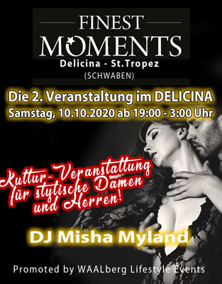 NEU – FINEST MOMENTS Augsburg – HERBST-KULTUR SPECIAL – Restaurant Delicina St.Tropez für stylisches Publikum! Präsentiert von WAALBERG EVENTS! – Heute mit Beats von Kult-DJ MYLAND & Live performance Gesang von Engel Agne! Feinstes Essen am Tisch serviert. Coole Drinks inklusive!!! Mit “Candyshop Süßes”! DRESS TO IMPRESS!!! Stylisch gut gekleidet, am liebsten Abendgarderobe – paßend zu unserem kulturellen Motto-Thementag. Eine gepflegte Atmosphäre, die zum Verweilen & Seele baumeln einlädt…