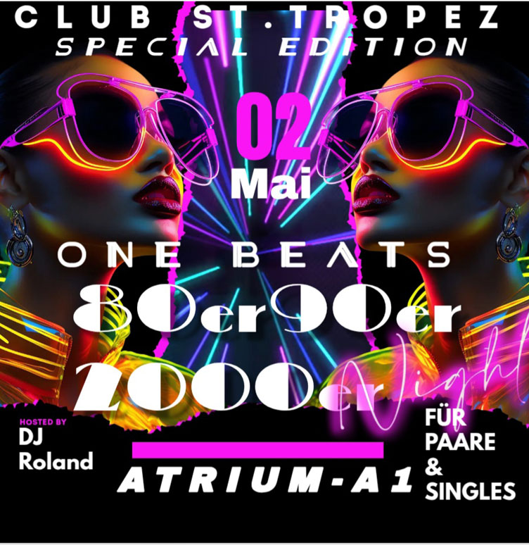 Mit den irren Party-Beats der 90er- & 00er-Jahre & aktuellen Hits am Dancefloor im ATRIUM A1, sowie Songs der 80er-Jahre an der kleinen DISCO.