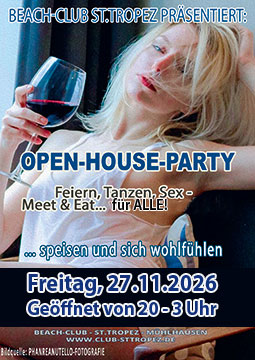 Die OPEN HOUSE Swingerparty mit Programm! Vor Silvester nochmal Feiern, Tanzen, Sex – Meet & Eat All Inclusive!!! – Erlebt einen geilen Swingerabend, wo Erleben und „Kommen“ Programm ist! DIE Swinger Clubparty! All Inklusive mit besten St.Tropez Köstlichkeiten und allen Getränken inklusive! Es wird wild und hemmungslos werden, wenn wir wieder zusammen eine richtig geilen Abend geniessen. Alles kann, nicht muss, aber es wird viel passieren!!! Wir lassen es wieder gemeinsam richtig krachen. Erlebt die SEX Arena in der Erotik Bar, wo Kopfkino und Sexuelle Erlebnisse wahr werden. – alles ist möglich – IHR entscheidet! Dazu das Top All Inklusive Angebot des St.Tropez mit einem Top Service, wie Ihr es gewohnt seid! Geöffnet von 20 – 3 Uhr.