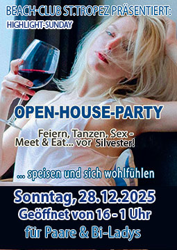 X Mas Paare & BI Ladies Sunday 28.12. Sonderöffnungszeit 16 bis 1 Uhr – Heute keine Single Herren! Die OPEN HOUSE Swingerparty Vor Silvester nochmal Wellness geniessen, Feiern, Tanzen, Sex – Meet & Eat All Inclusive!!! – Erlebt einen erotischen Swingerabend, mit Partysound von DJ RedK und grosser Wilder Süden Weihnachts-Verlosung mit Ozzy! All Inklusive mit besten St.Tropez Köstlichkeiten und allen Getränken inklusive. Wellness Area mit Whirlpool, Sauna und kostenlosen Massagen! Termine gibts vor Ort. Indoor Beach Paarespielwiese und Ozzy`s Erotik Bar mit special Sound und Lights geöffnet. Alles ist möglich – IHR entscheidet! Dazu das Top All Inklusive Angebot des St.Tropez mit einem Top Service, wie Ihr es gewohnt seid! Geöffnet von 16 – 1 Uhr.