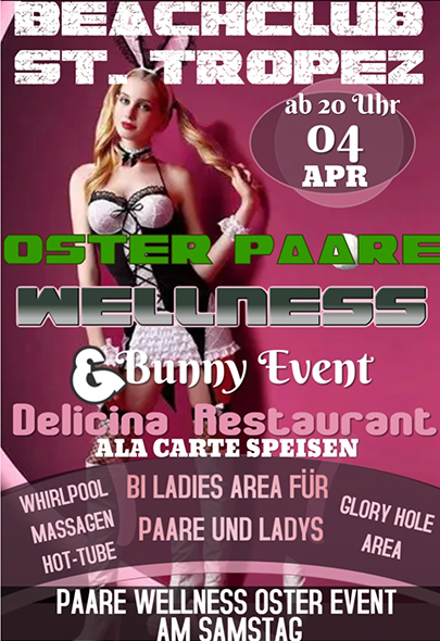 Samstag, 4. April 2026 – ab 20:00 bis ca. 4:00 Uhr. Heute feiern wir zusammen mit Paaren & Single-Ladies unser BUNNY -PAARE-WELLNESS-EVENT – Heute KEINE SINGLE HERREN! Dress to Impress!