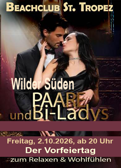 DER Paare Freitag mit Programm im Beach Club-St.Tropez & Barkeeper Chris!!! Nur für Paare und BI Ladies – HEUTE KEINE SINGLE HERREN – Der Treffpunkt für Paare jeden Altes zum Kennenlernen & Wiedersehen, ganz ohne Single Herren im St.Tropez für Paare und Damen! Sexy & Frivoler Dresscode! Geniessen und erleben! Massagen Kostenlos von Bini für die Damen und Herren, Musik von: DJ Deckmeister & 2 leckere Cocktails von Chris dem Barkeeper und St.Tropez Köstlichkeiten ALL INKLUSIVE! Feinstes Essen, wie ihr es von uns gewohnt seid. Heute ein vielseitiges Antipasti-Buffet, zum selbstnehmen. Coole Drinks inklusive!!! Eine gepflegte Atmosphäre, die zum Verweilen & Seele baumeln einlädt! Wellnessbereich mit Whirlpool, Massage & Sauna. Geöffnet von 20 – 2 Uhr.