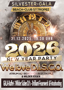 ATRIUM SILVESTER GALA 2025/2026 – We love D.I.S.C.O.!!! Wir werden euch mitnehmen in eine glamoröuse, frivole Silvester Nacht mit einem fantastischen Gala Menü im Beach-Club St.Tropez und dem Atrium A1. Es erwartet euch eine geile Atrium Party mit Songs aus allen Jahrzehnten und dem besten Mix der Wilder Süden DJ`s Ozzy und Deckmeister & DJane Sarah Liva!!! Gala Buffet, Mega Feuerwerk – feinster Prosecco zum Jahreswechsel und Silvester GALA-Buffet. Überraschungen sowie einem gigantischen Feuerwerk vor dem Haus. Guides vor Ort – 2 Paarebereiche uvm. –  Geniesst ein erstklassiges Silvester Gala Menü im Beach-Club St.Tropez und Atrium A1! Verwöhnt Euren Gaumen mit frisch und liebevoll zubereiteten Köstlichkeiten und Leckereien Ein erweiterter Essensbereich wird mit zusätzlichen Sitzplätzen ein entspanntes Genießen sicherstellen. Es erwartet Euch eine Vielfalt an phantastischen warmen Gerichten mit Geschmacksexplosions-Garantie, ein reichlich bestücktes 7m-langes Buffet mit kalten Delikatessen und Leckereien sowie einer zusätzlichen Dessert-Theke , die jeder „Naschkatze“ das Herz  höher schlagen lässt (Bitte entnehmt die Menükarte ca. 2 Wochen vor dem Event der Forum-Ausschreibung). Für Euer leibliches Wohl ist somit durchgehend bis spät in die Nacht gesorgt!