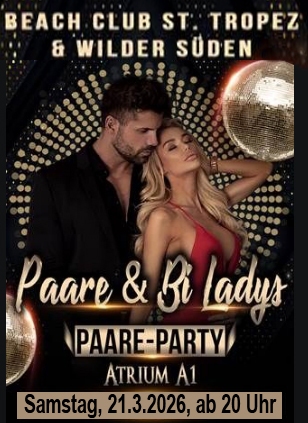 WILDER SÜDEN PAAREABEND – ALL AGES WELCOME – Nur für Paare und BI Ladies – HEUTE KEINE SINGLE HERREN – Der Treffpunkt für Paare jeden Altes zum Kennenlernen & Wiedersehen, ganz ohne Single Herren! Ozzy Rahmenprogramm mit Knicklichtkontaktbörse – BI Ladies Areas – Wilder Süden Erotik Bar und Guides for Beginners! Atrium A1 und Atrium Lounge sind zum Feiern und Erleben geöffnet. Köstlichkeiten geniessen in unserem Delicina St.Tropez UND Atrium für Paare, Jungs und Damen! Sexy & Frivoler Dresscode! Geniessen und erleben! ALL INKLUSIVE! Feinstes Essen, wie ihr es von uns gewohnt seid. Heute dazu ein vielseitiges Antipasti-Buffet, das keine Wünsche offen lässt! Coole Drinks inklusive!!! Eine gepflegte Atmosphäre, die zum Verweilen & Seele baumeln einlädt! Geöffnet von 20 – 4 Uhr.