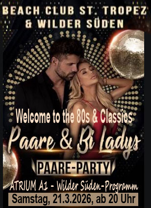 Der Treffpunkt für Paare jeden Altes zum Kennenlernen & Wiedersehen, ganz ohne Single Herren! Ozzy „Warm Welcome“ mit Welcome Drinks und Paare Knicklichtkontaktbörse – BI Ladies Areas – Wilder Süden Erotik Bar und Guides for Beginners! Atrium A1 und Atrium Lounge sind zum Feiern und Erleben geöffnet. Köstlichkeiten geniessen in unserem Delicina St.Tropez UND Atrium für Paare, Jungs und Damen! Sexy & Frivoler Dresscode! Geniessen und erleben! ALL INKLUSIVE! Feinstes Essen, wie ihr es von uns gewohnt seid. Heute dazu ein vielseitiges Antipasti-Buffet, das keine Wünsche offen lässt! Coole Drinks inklusive!!! Eine gepflegte Atmosphäre, die zum Verweilen & Seele baumeln einlädt! Geöffnet von 20 – 4 Uhr.